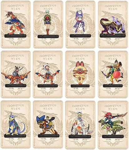 + Set 12 thẻ Amiibo Monster Hunter Stories 2 + Monster Hunter Rise, Monster Hunter Stories 1 bao gồm: Barrioth & Ayuria, Naribu, One-Eyed Rathalos & Rider Female, One-Eyed Rathalos & Rider Male, Qurupeco & Dan, Rathian & Chevel. Monster Hunter Rise bao gồm: Magnamalo, Palamute và Palico. Ena, Tsukino và Razewing Ratha.